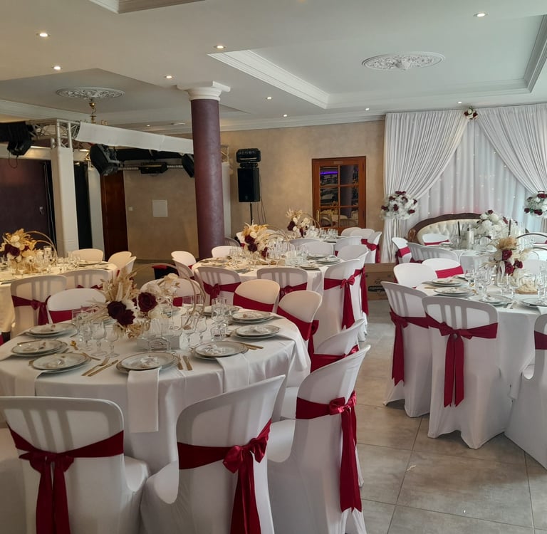 La première salle de réception de 75 m² offre une ambiance élégante et chaleureuse. Avec ses colonnes romaines, ses murs en marbre et son sol raffiné, elle apporte immédiatement du cachet à votre événement.